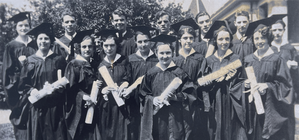In 1924, a ninth grade class was offered with the intention of building up the curriculum yearly so that a full four-year high school could be formed. He purchased a piece of property on the corner of 6th Avenue and 13th Street across from the rectory, renovated it for a high school and engaged the Sisters of St. Joseph to form its faculty. Although the building’s structure and facilities were not comparable to the public high school, these disadvantages were overlooked by the parents who enrolled their children in St. Joseph High School and who were amply rewarded by the solid education their sons and daughters received. The Class of 1928, with 7 students, became the first alumni of St. Joseph High School.